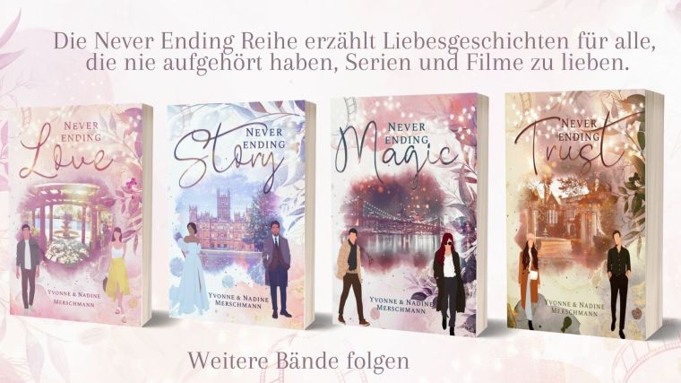 Die Never Ending Reihe schreibe ich als Autorenduo zusammen mit meiner Zwillingsschwester Nadine. Gemeinsam lassen wir unsere Liebe für Serien, Filme, wunderschöne Orte und große Gefühle in den Geschichten einfließen. Jeder Band steht für sich und kann ganz unabhängig von den anderen Bänden gelesen werden. Die Bücher sind cozy Wohlfühlromane mit jeweils etwa 250 Seiten. Alle Bücher sind in jeder Buchhandlung sowie online erhältlich.
